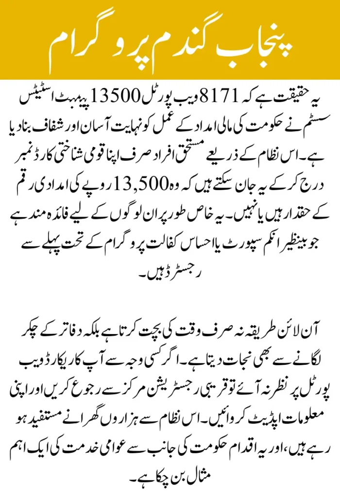 8171 ویب پورٹل ایک آسان آن لائن پلیٹ فارم ہے جہاں آپ اپنا شناختی کارڈ نمبر درج کر کے یہ معلوم کر سکتے ہیں کہ آپ کو حکومت کی طرف سے 13,500 روپے کی مالی امداد ملے گی یا نہیں۔ یہ سسٹم خاص طور پر ان لوگوں کے لیے ہے جو بینظیر انکم سپورٹ یا احساس کفالت پروگرام کے تحت رجسٹرڈ ہیں۔