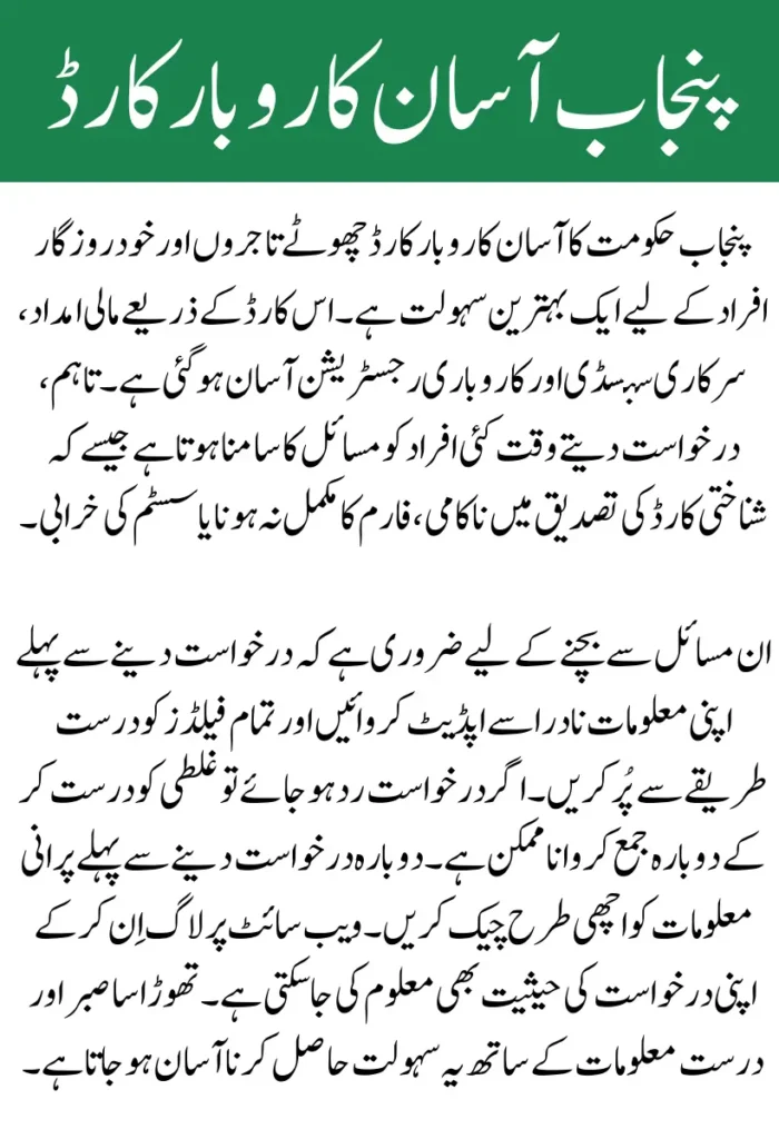 پنجاب حکومت کے آسان کاروبار کارڈ کا مقصد چھوٹے تاجروں کو مالی مدد اور رجسٹریشن کی سہولت فراہم کرنا ہے۔ اگرچہ یہ اسکیم بہت مفید ہے، لیکن بہت سے لوگ درخواست دیتے وقت مختلف مسائل کا سامنا کرتے ہیں۔ عام طور پر یہ مسائل شناختی کارڈ کی تصدیق نہ ہونے، فارم میں غلط معلومات دینے یا سسٹم کی تکنیکی خرابی کی وجہ سے پیدا ہوتے ہیں۔