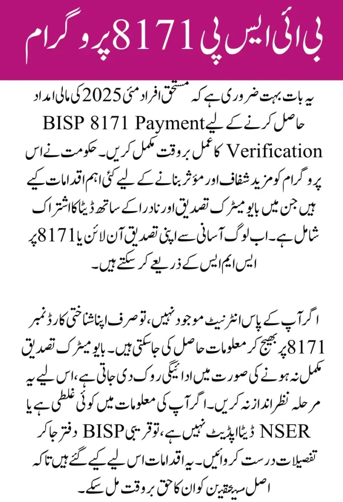 | Verification Methods | Online portal (8171.bisp.gov.pk), SMS to 8171, Biometric at BISP centers |