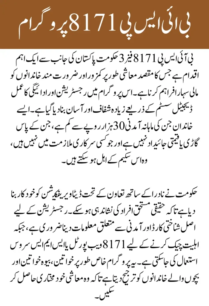 بی آئی ایس پی 8171 فیز 3 حکومت پاکستان کی ایک اہم کاوش ہے جس کا مقصد غریب اور مستحق خاندانوں کو مالی معاونت فراہم کرنا ہے۔ اس مرحلے میں رجسٹریشن کا عمل آسان بنایا گیا ہے تاکہ ہر ضرورت مند فرد اپنی معلومات دے کر امداد حاصل کر سکے۔ نادرا کے ساتھ ڈیٹا شیئرنگ کے ذریعے اس بار شفافیت کو مزید بہتر کیا گیا ہے۔ ان خاندانوں کو ترجیح دی جا رہی ہے جن کی آمدنی کم ہے اور جن کے پاس کوئی مستقل ذریعہ معاش نہیں ہے۔