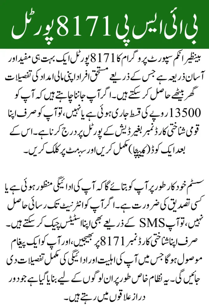 بینظیر انکم سپورٹ پروگرام نے 8171 پورٹل کے ذریعے مستحق افراد کو اپنی ادائیگی کی تفصیلات جاننے کا ایک آسان راستہ فراہم کیا ہے۔ اب افراد گھر بیٹھے صرف اپنا شناختی کارڈ نمبر درج کرکے چیک کر سکتے ہیں کہ انہیں 13500 روپے کی قسط موصول ہوئی ہے یا نہیں۔ یہ طریقہ خاص طور پر ان لوگوں کے لیے مددگار ہے جو دور دراز علاقوں میں رہتے ہیں اور بار بار دفاتر جانے کی سکت نہیں رکھتے۔