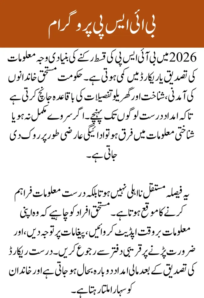 This article explains the issue of BISP installments being stopped in 2026 and provides clear guidance for affected beneficiaries. It covers how the payment system works, why verification is required, how CNIC-based checks help identify problems, and what actions can restore assistance. Readers will understand the process and learn how to avoid delays in future payment cycles.