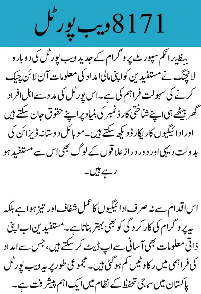 The re-launch of the BISP 8171 Web Portal is a significant step toward making social welfare services more accessible and transparent for beneficiaries across Pakistan. By enabling easy online checks for eligibility and payments, the portal saves time, reduces the need for physical visits, and helps ensure that support reaches those who need it most.