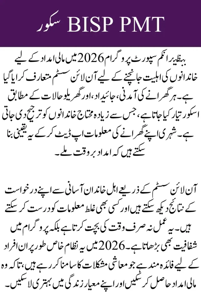 The Poverty Scorecard (PMT) is a tool used by BISP to identify families most in need. The PMT score is calculated based on household income, family size, property ownership, and other socioeconomic indicators. A lower PMT score indicates a higher priority for financial support. With the 2026 updates, the PMT system is fully digital, allowing citizens to check their status online through their CNIC for a faster and more transparent process.
