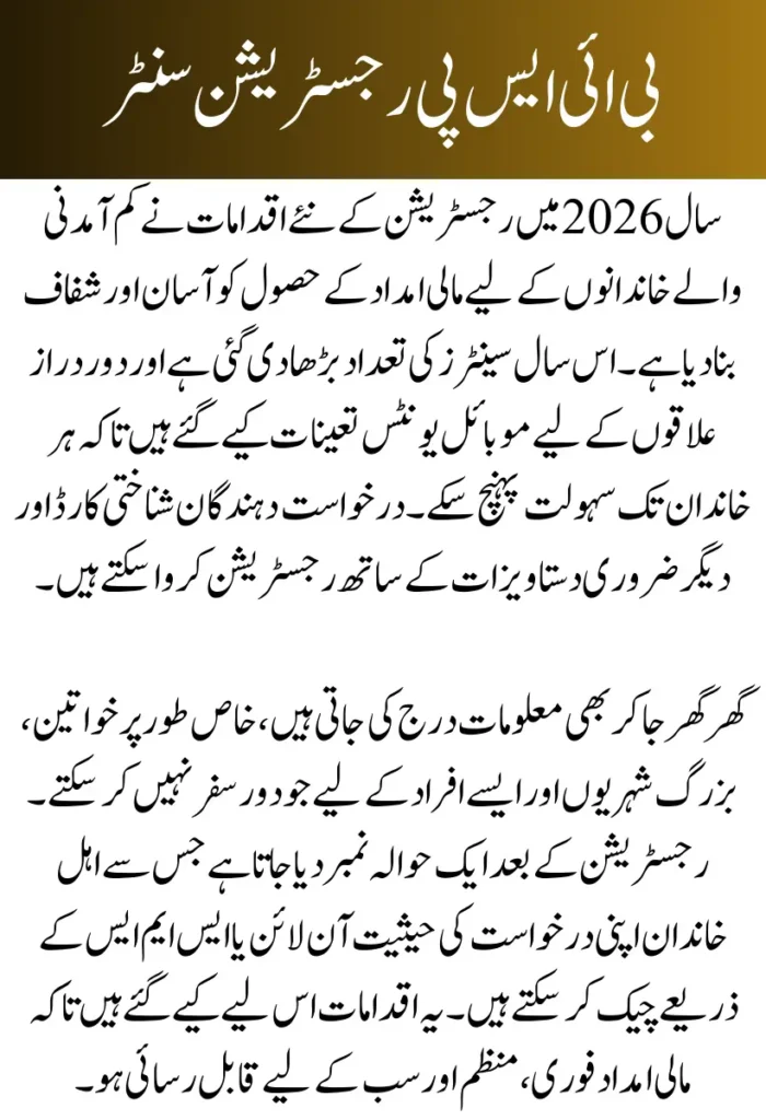 Applicants can verify their registration status using their reference number. This allows families to track approval, corrections, or pending updates without visiting the center repeatedly, improving convenience and transparency for everyone at BISP Registration Centers 2026.