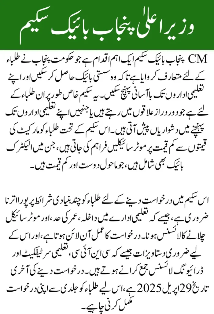 وزیراعلیٰ پنجاب بائیک سکیم پنجاب حکومت کی جانب سے مستحق طلباء کو موٹرسائیکلیں فراہم کرنے کے لیے شروع کی گئی ایک پہل ہے۔ اس اسکیم کا مقصد نقل و حمل کو مزید سستی اور قابل رسائی بنانا ہے، جس سے طلباء اپنے تعلیمی اداروں میں آسانی کے ساتھ سفر کر سکیں۔ جیسا کہ ہم 2026 تک پہنچتے ہیں، دلچسپی رکھنے والے درخواست دہندگان کو درخواست دینے کے عمل، آخری تاریخ، اور اہلیت کے تقاضوں کو سمجھنے کی ضرورت ہوتی ہے۔
