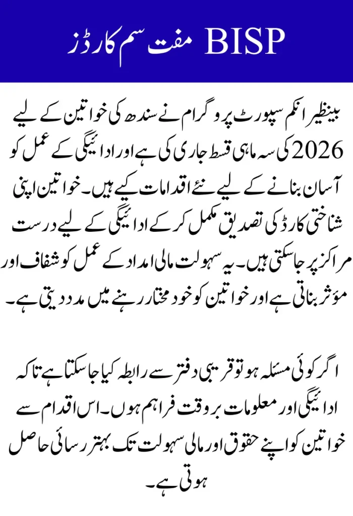 The provision of BISP Free SIM Cards alongside the March 2026 qist enhances both communication and financial accessibility for Sindh women. By combining secure SIM registration with timely payments, the program ensures transparency and empowerment for beneficiaries. Women are encouraged to complete CNIC verification and activate their SIM cards to fully benefit from this initiative.