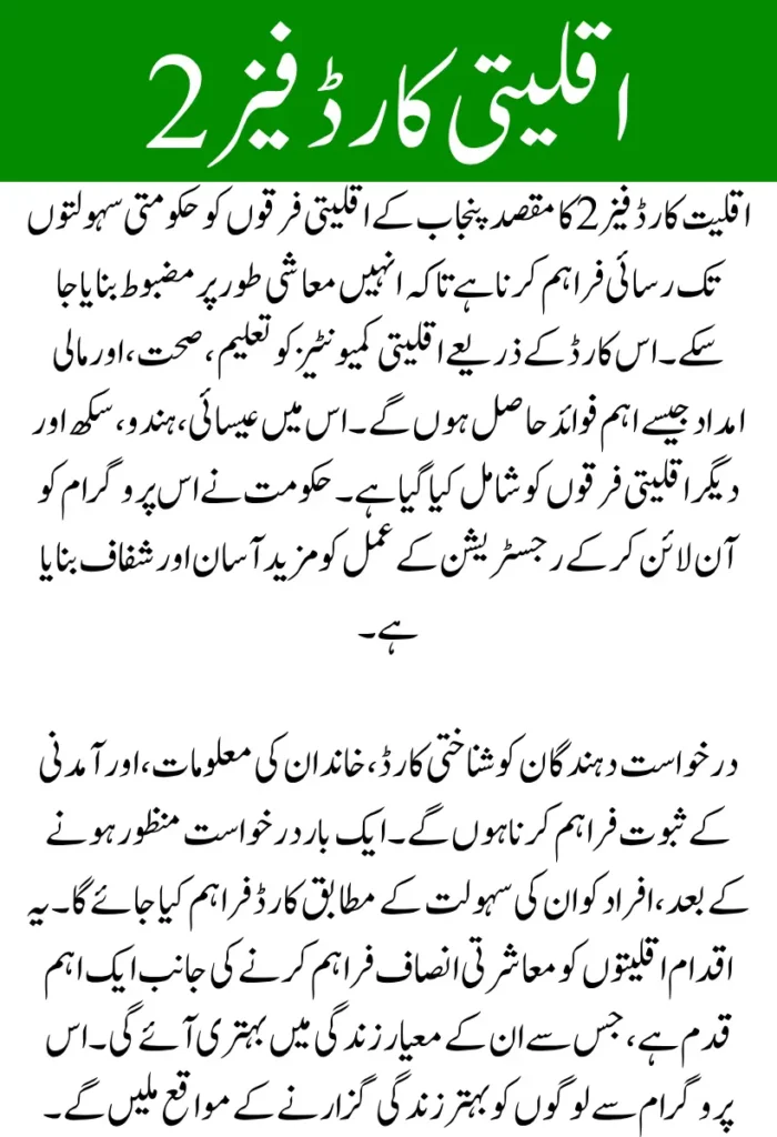 Minority card phase 2 is a continuation of a welfare initiative launched by the Punjab government for religious minorities. The card acts as an identity for accessing various government-sponsored support programs specifically designed for underserved communities. These include monthly stipends, medical subsidies, and education-related benefits. The program primarily serves Hindus, Christians, Sikhs, and other recognized minorities in Punjab.