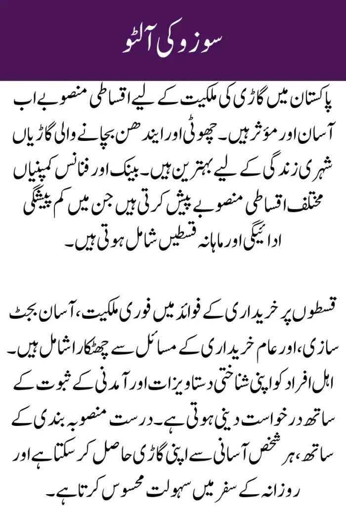 To buy a Suzuki Alto in Pakistan through installments, follow these steps: