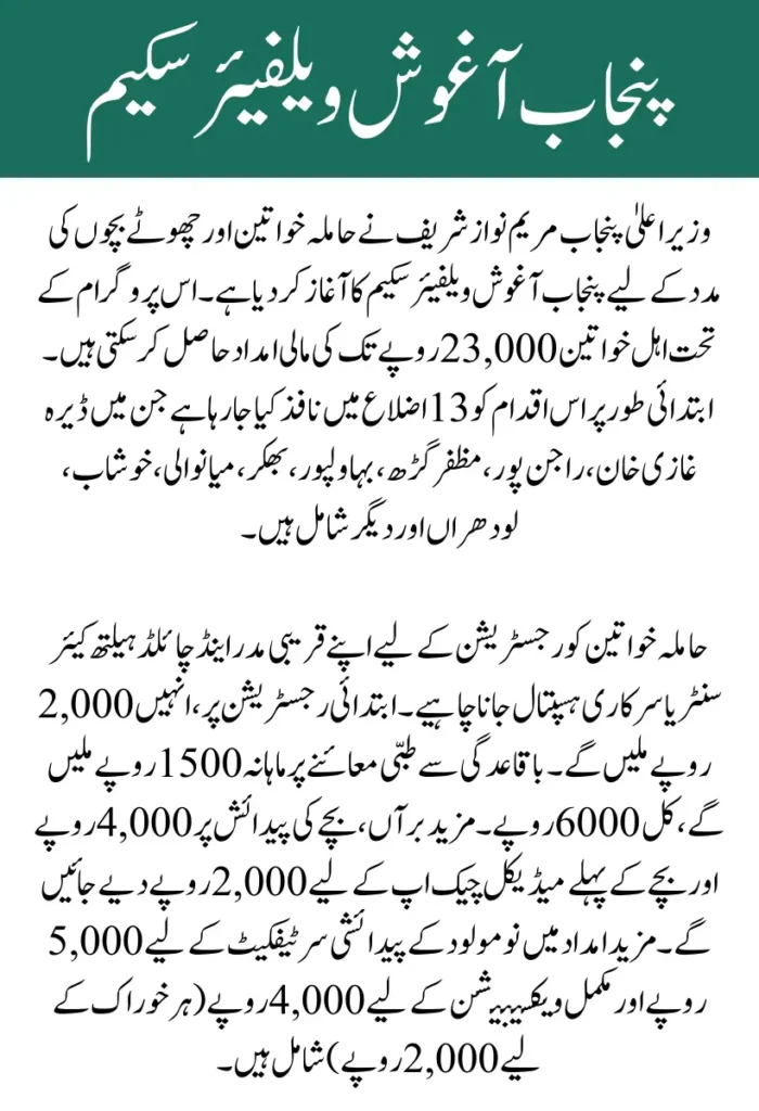 Chief Minister Punjab Maryam Nawaz Sharif has introduced the Punjab Aghosh Scheme 2026, offering Rs 23,000 in financial aid to pregnant women and mothers of children under two years of age. Initially, 13 districts were included in the program, such as Dera Ghazi Khan, Tonsa, Rajanpur, Muzaffargarh, Kot Addu, Rahim Yar Khan, Bahawalpur, Bahawalnagar, Bhakkar, Mianwali, Khushab, Lodhran, and two other districts in South Punjab.