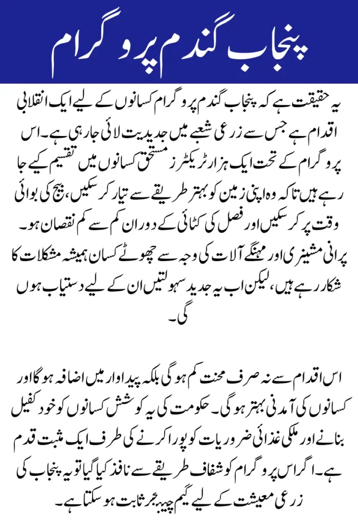 پنجاب گندم پروگرام پنجاب کے وزیرِ اعلیٰ کی جانب سے شروع کیا گیا ہے جس کا مقصد کسانوں کو جدید مشینری فراہم کرنا ہے تاکہ وہ اپنی گندم کی فصل کو بہتر طریقے سے اگا سکیں۔ اس پروگرام کے تحت 1000 ٹریکٹرز مستحق کسانوں میں تقسیم کیے جا رہے ہیں، خاص طور پر ان کسانوں کو جو مالی مشکلات کا سامنا کرتے ہیں اور جو جدید آلات خریدنے کی استطاعت نہیں رکھتے۔